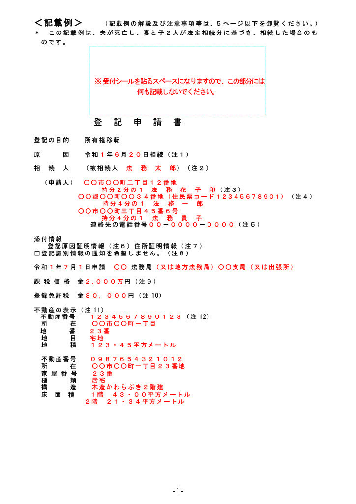 参照:所有権移転登記申請書(相続・遺産分割)(記載例)|法務局