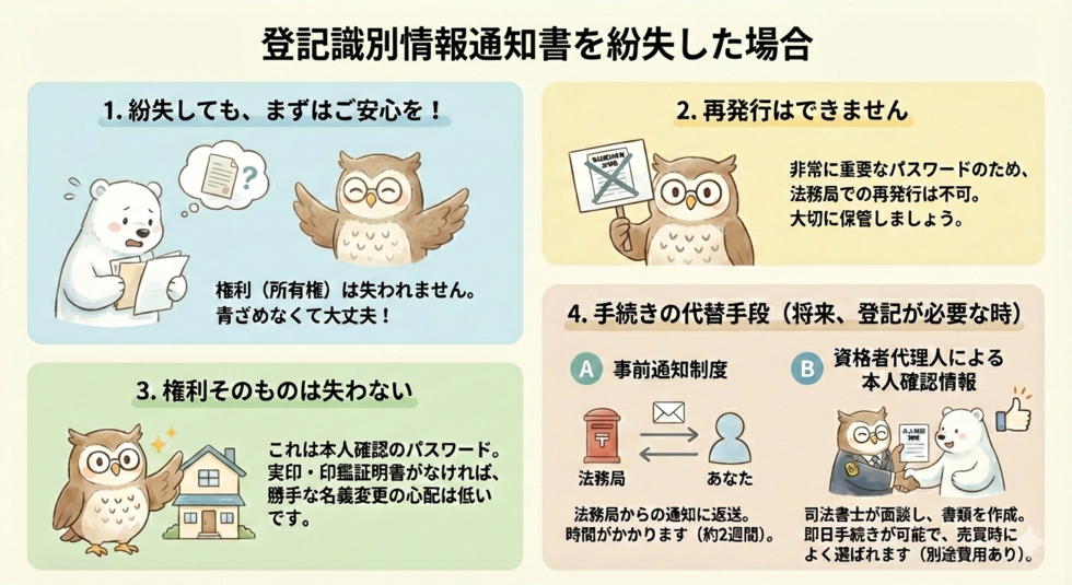 万が一紛失しても不動産の権利は失われず、「事前通知制度」や司法書士による「本人確認情報」といった代替手段で手続きが可能です 。