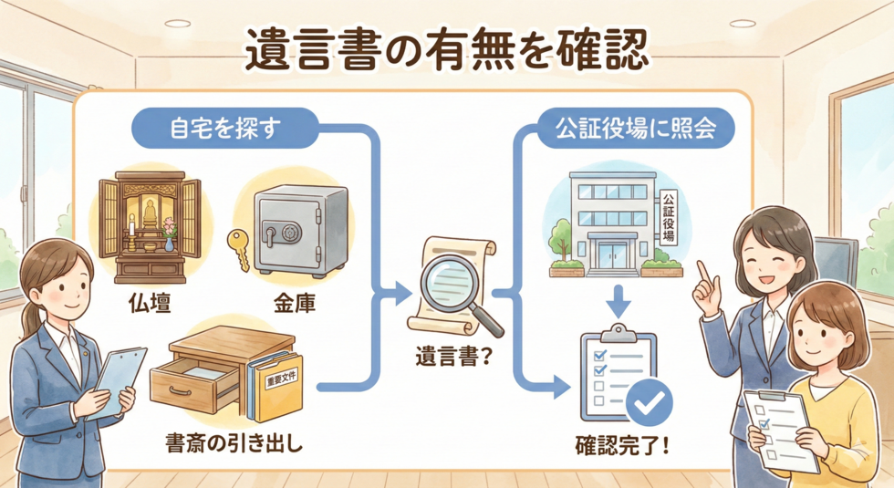 思い込みで調査を省略せず、必ず以下の方法で遺言書の有無を確認しましょう。